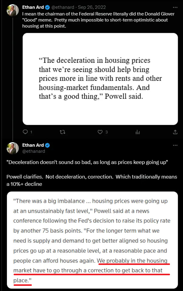 It’s not that Powell wants real estate to suffer, it’s just that his priority is to drive inflation down. Moreover, he has stated that if prices do go down, that will set the stage for future sustained growth “at a reasonable pace”. It doesn’t matter if we think he is right (though I do). What matters that he believes it, and has stated it in public.